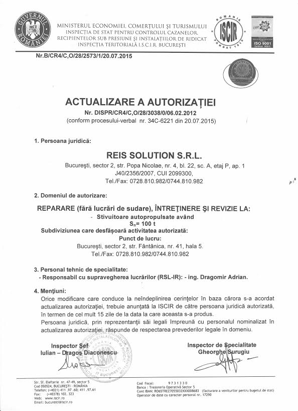 Detinem autorizatie de reparatie ISCIR pentru echipamente de ridicat